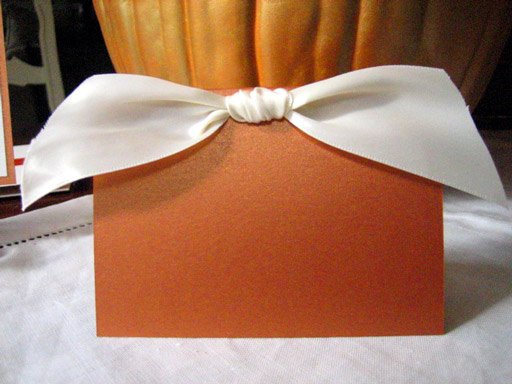 Autumn Harvest is a dramatic, shimmering pearl pocket-fold invitation.  Inner layers are shimmering copper and pearl.  Coppery grosgrain ribbon wraps around the front of the invitation adorned with front double layer tag.  Pocket size is approximately 5.5" x 5.5"