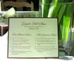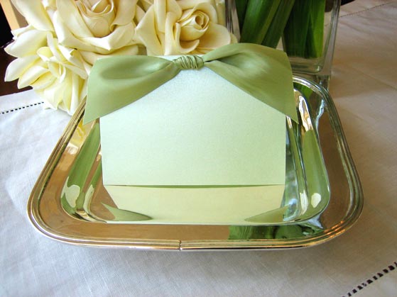Evening Stroll makes a statement!  The shimmering brown pocket contrasts beautifully with the minty shimmering green card.  A green monogram is placed on the outside of the pocket and the inside contains the invitation, and all other stationery essentials.  Wow!  Approximately 5" x 7".