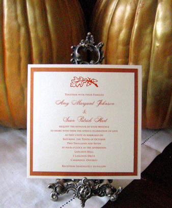 Firelight is warm and inviting!  Two pearl-coloured shimmering layers & a dramatic copper inner border make it a welcome invitation with a lovely accessories.  This square invitation is three layers and about 6.25" x 6.25".  Copper printing shown.