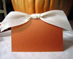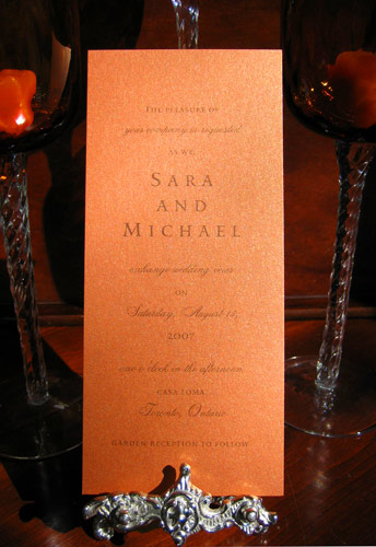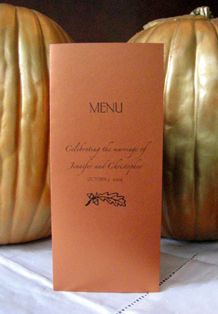 Matching set includes copper program, menu, place card, thank you card, etc.  Invitation is about 4" x 9".  Brown printing shown.