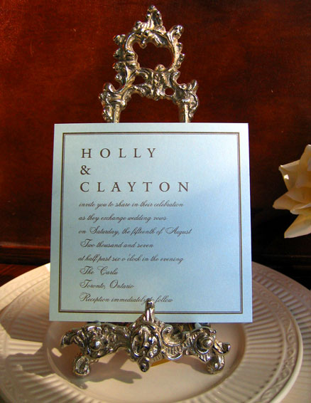 Island Paradise is a modern classic!  A single aqua-coloured shimmering cardstock with a brown printed border gives the illusion of two layers without the added expense. Single layer approximately 6.25" x 6.25" Square Invitation.  Brown printing shown.