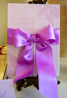Lavender Gown is a modern classic!  Adorned with  a wrinkle-resistant ivory satin bow, this invitation consists of a green vellum jacket enveloping a pale green shimmering printed cardstellum!  Stunning!  Approximately 5" x 7".