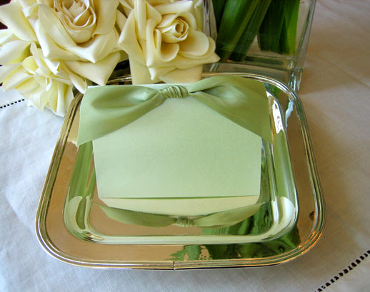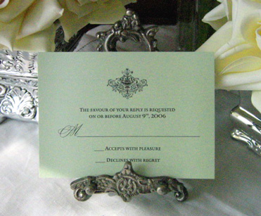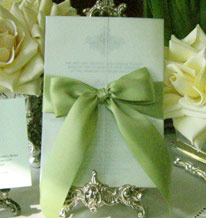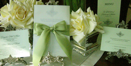 A romantic evening at The Manor.  Similar to Twilight, this invitation is a platinum vellum jacket wrapped with a wrinkle-resistant spring green bow the outside.  Inside, a shimmering green card reveals your wording!Invitation is 5" x 7".  Black printing shown.