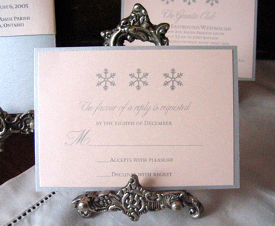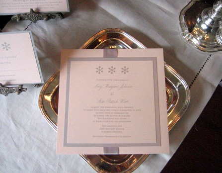 Winter Mist is a must-have for the perfect winter event!  Two shimmering pink layers & a silver middle layer are complimented by a silver satin ribbon!  Three layers and approximately 6.25" x 6.25" Square Invitation.  Silver/Gray printing shown.